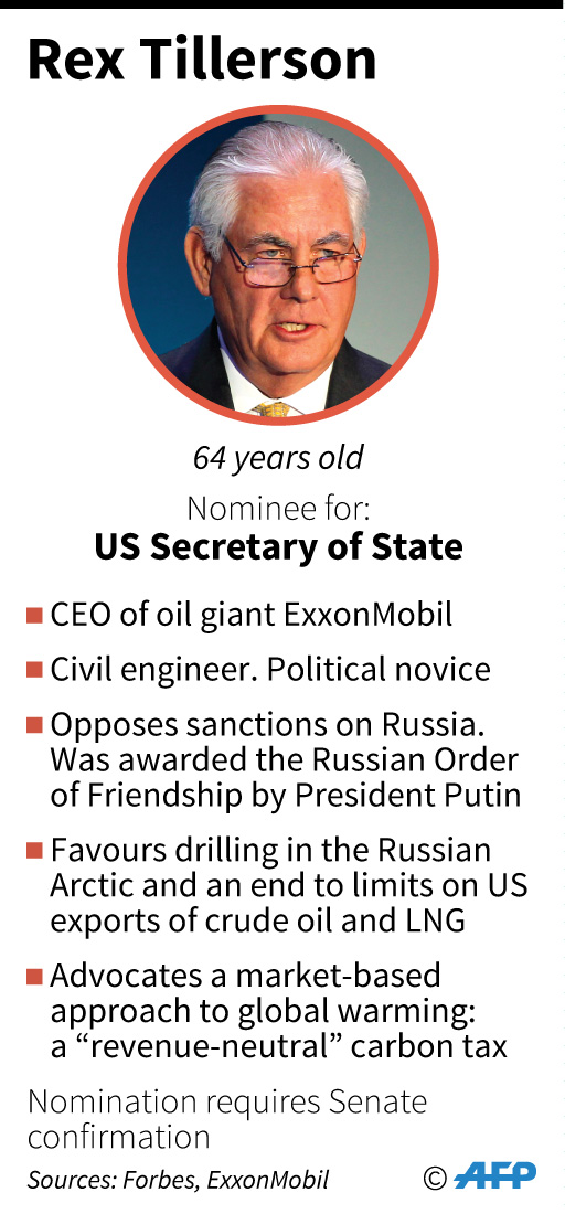 WASHINGTON, United States (AFP) – US President-elect Donald Trump on Tuesday tapped ExxonMobil chief Rex Tillerson as his nominee to be secretary of state, despite concerns on both sides of the political aisle about the oilman’s deep ties to Russia.