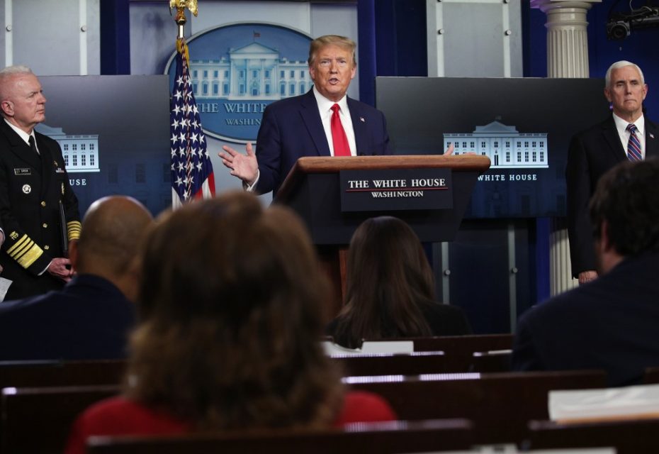 U.S. President Donald Trump speaks at the daily briefing of the coronavirus task force at the White House April 20, 2020 in Washington, DC. Oil prices fell below zero today due to collapsed energy demand and near capacity of storage tanks in the U.S., triggered by the COVID-19 pandemic lockdown. Alex Wong/Getty Images/AFP