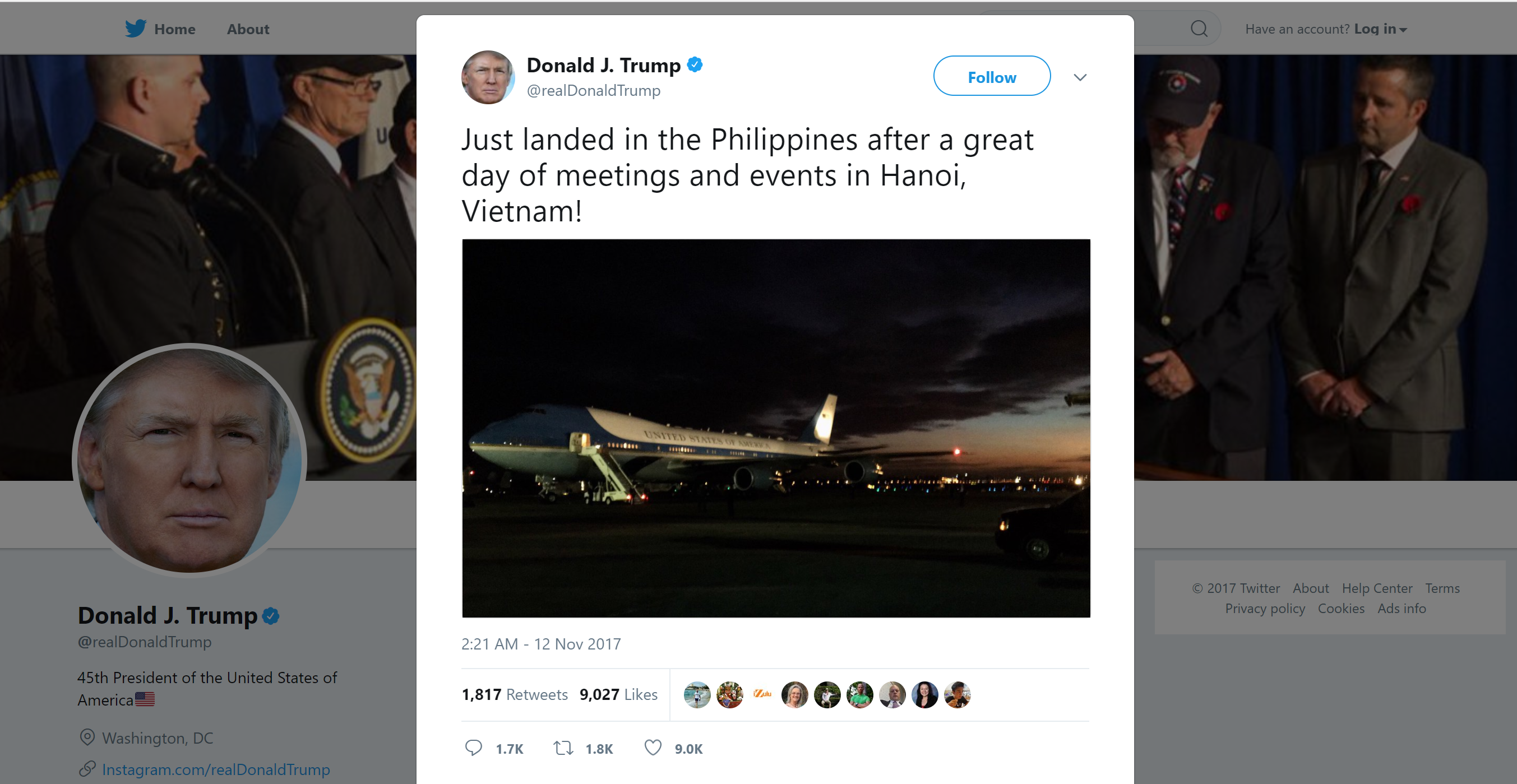 US President Donald Trump tweeted his arrival in the Philippines in Sunday night, saying “Just landed in the Philippines after a great day of meetings and events in Hanoi, Vietnam!”