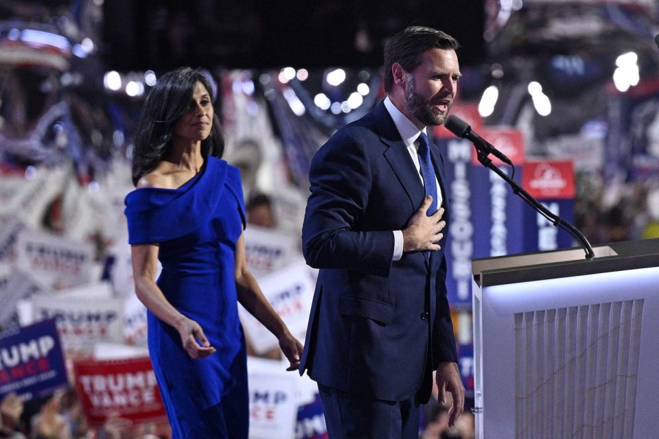 US Senator from Ohio and 2024 Republican vice presidential candidate J.D. Vance (R) gestures after speaking alongside his wife Usha Vance during the third day of the 2024 Republican National Convention at the Fiserv Forum in Milwaukee, Wisconsin, on July 17, 2024. Days after he survived an assassination attempt Donald Trump won formal nomination as the Republican presidential candidate and picked Ohio US Senator J.D. Vance for running mate. (Photo by Brendan SMIALOWSKI / AFP)