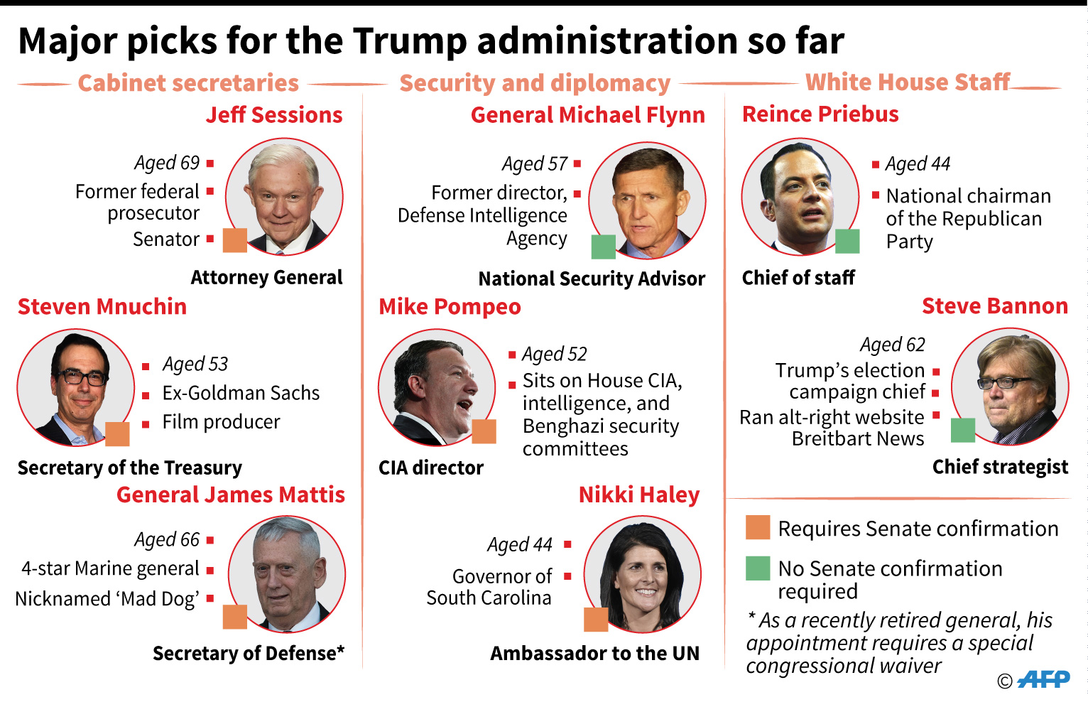 The following is a list of key cabinet and other nominations made so far by Trump, who takes office on January 20: