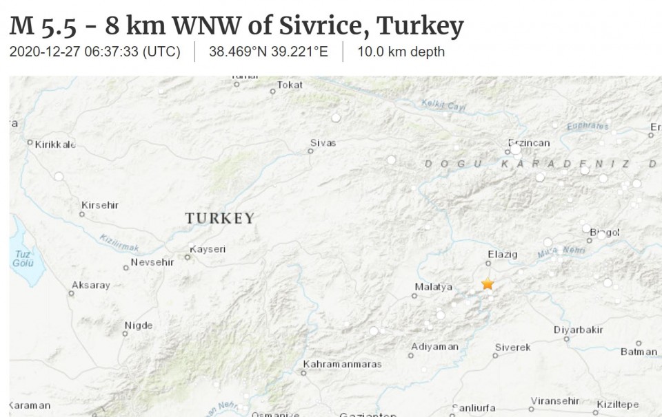 The USGS said the quake was registered in the Sivrice district in Elazig province at 0637 GMT and struck at a depth of 10 kilometres.