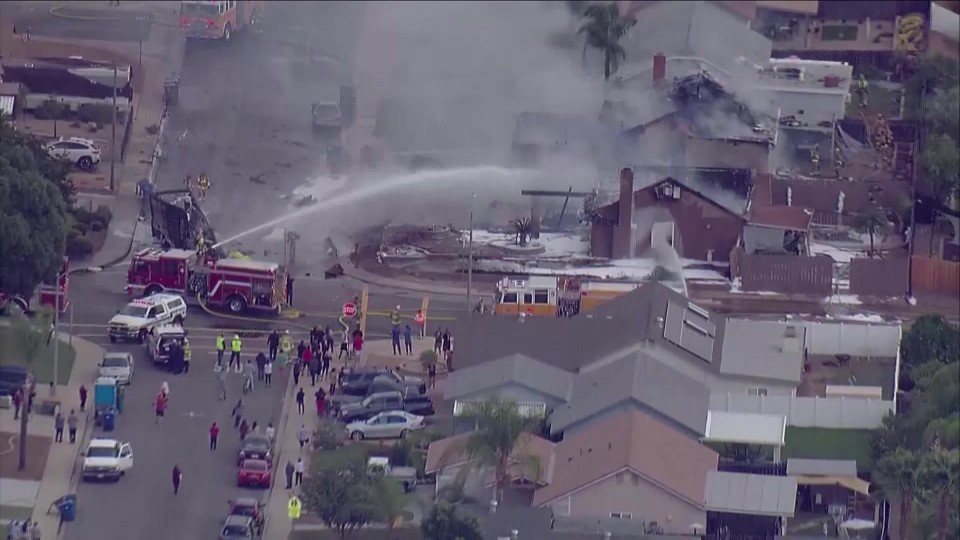 Aerial footage showed firefighters hosing down the charred remains of the residences in Santee, a suburb of San Diego.