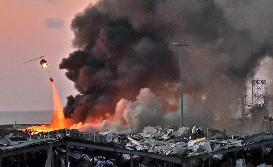 A helicopter puts out a fire at the scene of an explosion at the port of Lebanon’s capital Beirut on August 4, 2020. (Photo by STR / AFP)