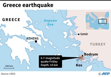 BODRUM, Turkey (AFP) — At least two people were killed on the Greek island of Kos Friday when a magnitude-6.7 earthquake shook the popular summer resort holiday destinations of the Dodecanese Islands in Greece and the Aegean coast of Turkey.