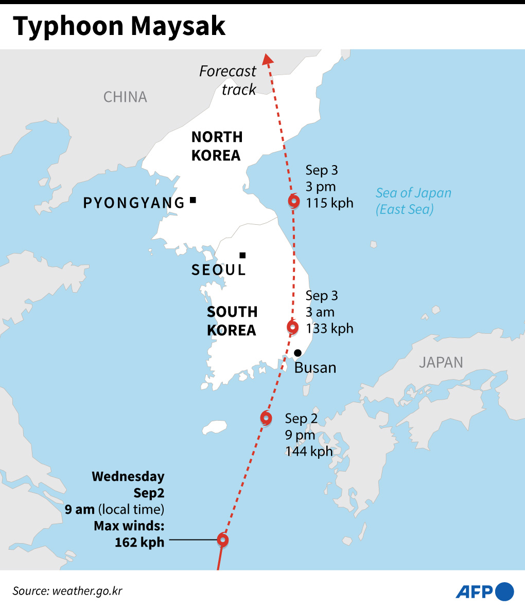 Maysak — named after a Cambodian tree — was predicted to make landfall late Wednesday west of Busan on the southern coast, then make its way up the eastern side of the peninsula before heading northwards into the Sea of Japan, known as the East Sea in Korea.