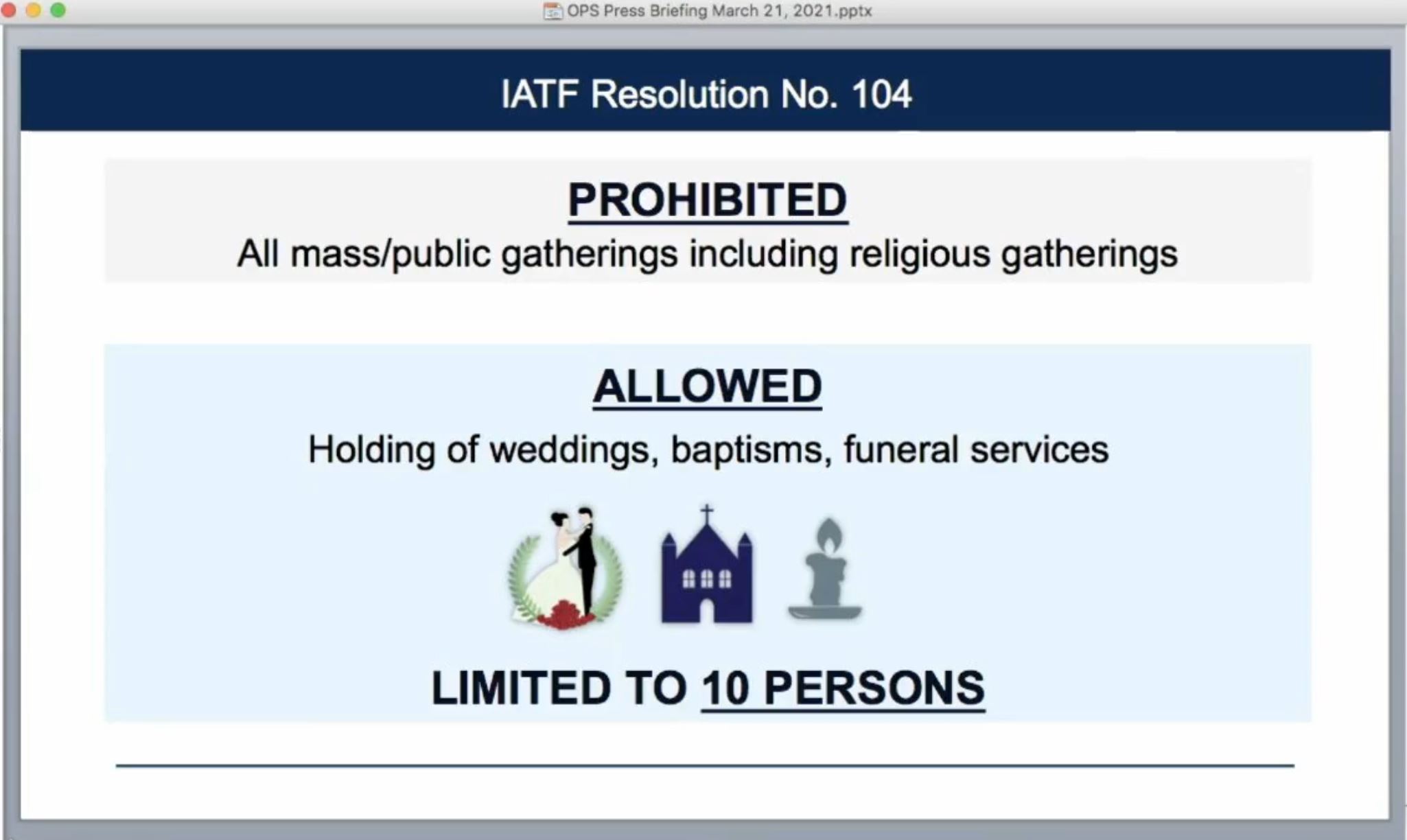 “Ipinagbabawal po ang lahat ng mass at public gatherings kasama na po ang religious gatherings. Iyong tinatawag po nating KBL – Kasal, Binyag at Libing – ay pinapayagan po pero hanggang sampung tao lang po ang pupuwedeng dumalo (All mass and public gatherings, including religious gatherings are prohibited. What we call KBL [in the vernacular] – wedding, baptisms and funerals — are allowed but limited to 10 persons could attend)” Presidential Spokesperson Harry Roque announced on Sunday, March 21.