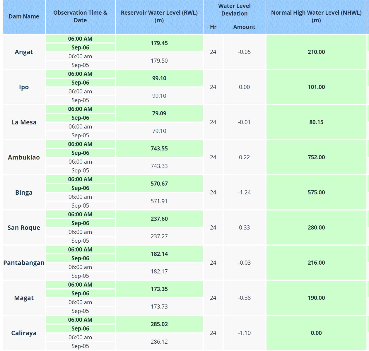 The other dams had a decrease in water level: Angat dam had a decrease of five centimeters (179.50 meters to 179.45 meters); La Mesa dam had a centimeter of decrease (79.10 meters to 79.09 meters); Binga dam had a decrease of 1 meters and 24 centimeters (571.91 meters to 570.67 meters); Pantabangan had a three centimeter decrease in water level (182.17 meters to 182.14 meters); Magat dam had a 38 centimeter decrease (173.73 meters to 173.35 meters); and Caliraya dam had a decrease of 1 meter and 10 centimeters in water level overnight. This was as of 6 a.m. Sunday, Sept. 6.