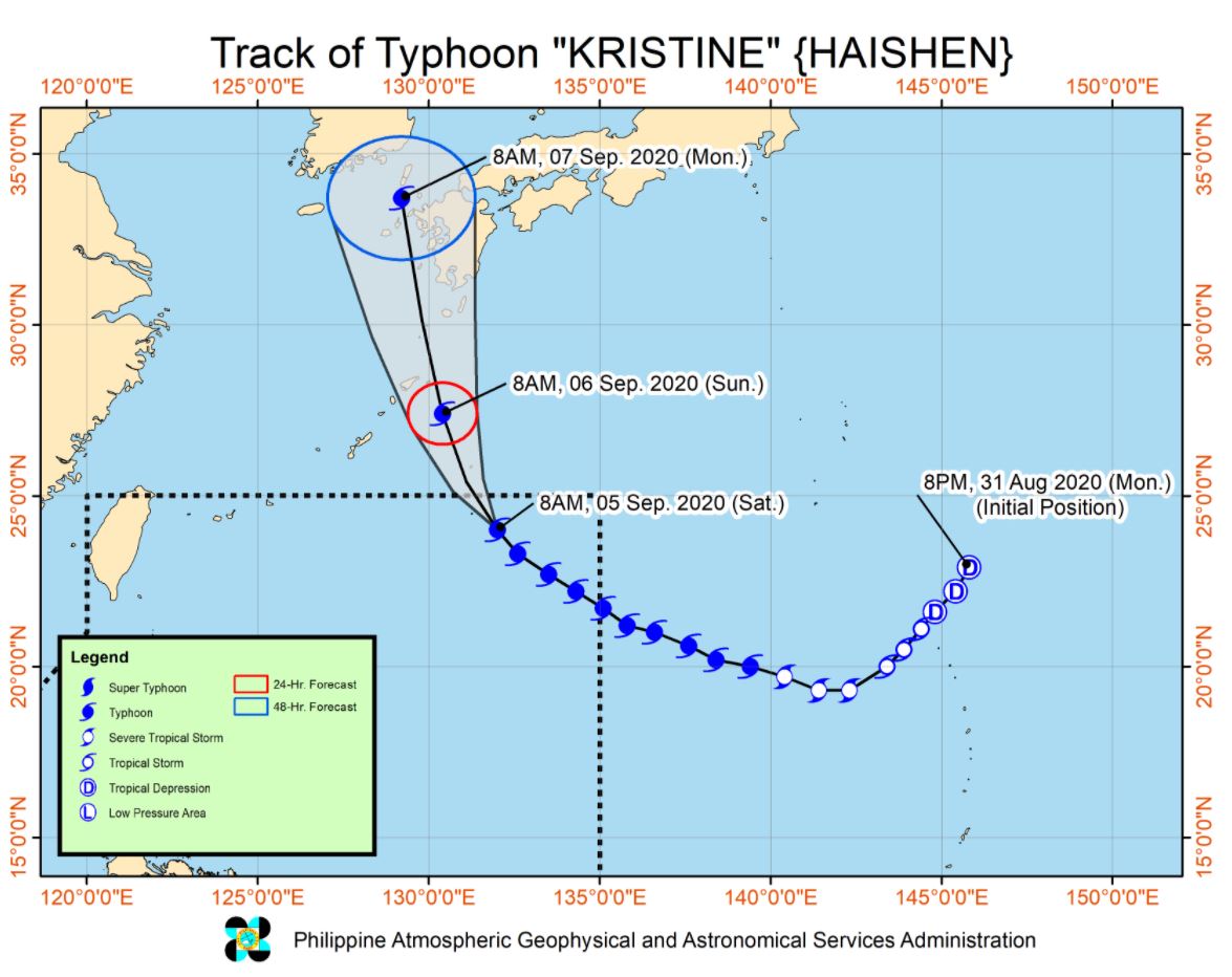 “It is then expected to turn north-northwestward beginning tonight and pass close to Northern Amami Islands and Tokara Islands in the Ryukyu Archipelago (Japan) between tomorrow noon and evening. Afterwards, the typhoon will head towards the sea off the west coast of Kyushu (Japan) and the Korean Peninsula,” the PAGASA bulletin issued at 11 a.m. Saturday, Sept. 5, said.