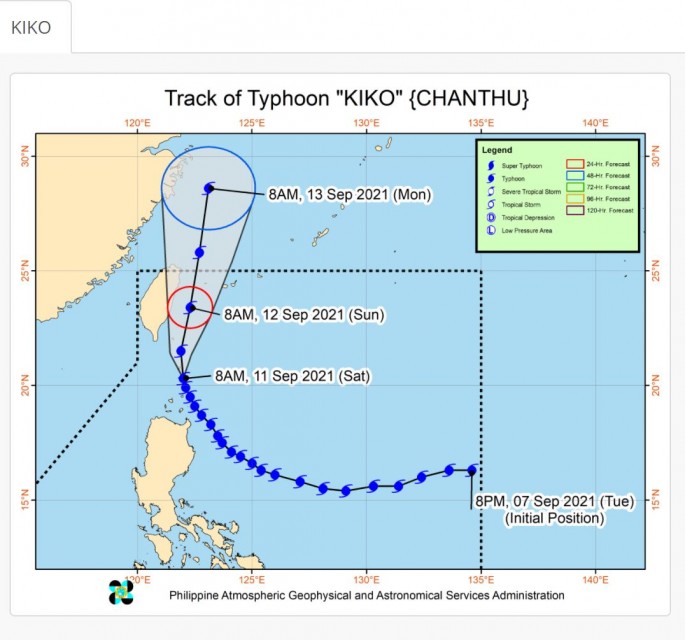As of 10 a.m., the center of the eye of typhoon “KIKO” was located over the coastal waters of Itbayat, Batanes.