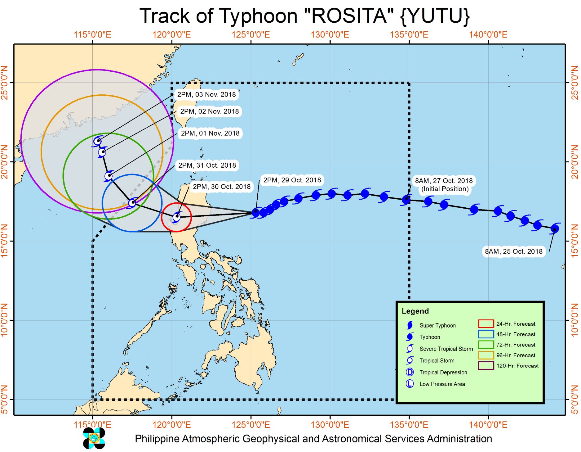Typhoon Yutu or Rosita is forecast to exit landmass by tomorrow afternoon, Tuesday, Oct. 30, and exit the Philippine Area of Responsibility by Wednesday evening, Oct. 31.