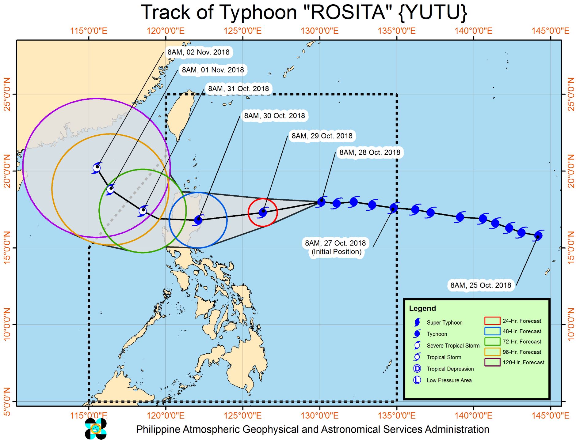 It continues to move westward towards northern Luzon at 20 kph. As of 10 a.m. on Sunday, October 28, “the eye of Typhoon ‘Rosita’ (international name Yutu) was located based on all available data at 875 km East of Aparri, Cagayan (18.0 °N, 129.9 °E ).”