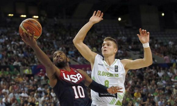 The Slovenians held their own valiantly in the opening half against the Americans and were only 49-42 down at the interval as forward Domen Lorbek produced a superb performance.