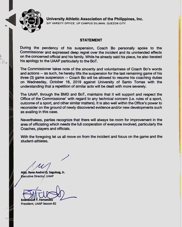 “While he already said his piece, he also iterated his apology to the UAAP, particularly the (Board of Trustees),” the UAAP said.