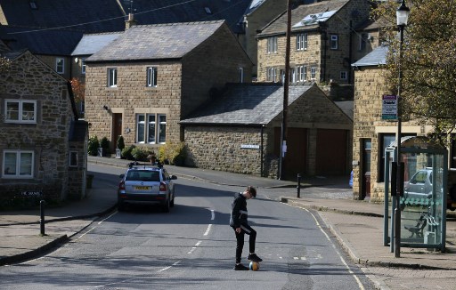 A boy plays football in a quiet street in the village of Eyam in Derbyshire, northern England on March 23, 2020. (Photo by Lindsey Parnaby / AFP)