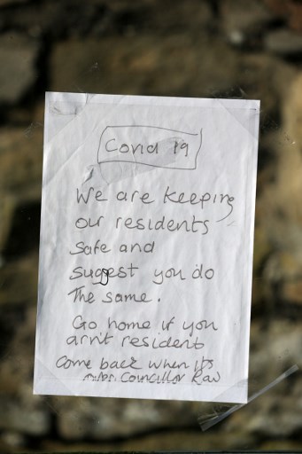 A sign asks non residents to go home to avoid the spread of coronavirus in the village of Eyam in Derbyshire, northern England on March 23, 2020. (Photo by Lindsey Parnaby / AFP)