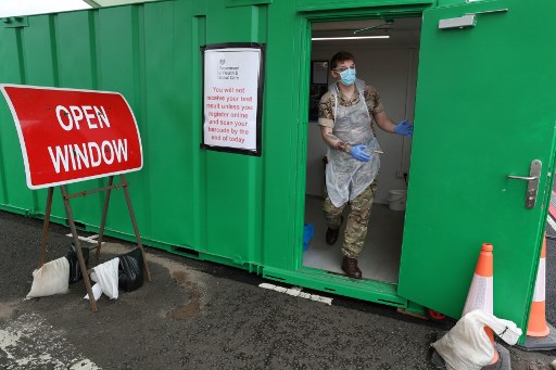 A soldier from 2 Scots Royal Regiment prepares to test key workers for the novel coronavirus Covid-19 at a drive-in testing centre at Glasgow Airport on April 29, 2020, as the UK continues in lockdown to help curb the spread of the coronavirus. (Photo by Andrew Milligan / POOL / AFP)