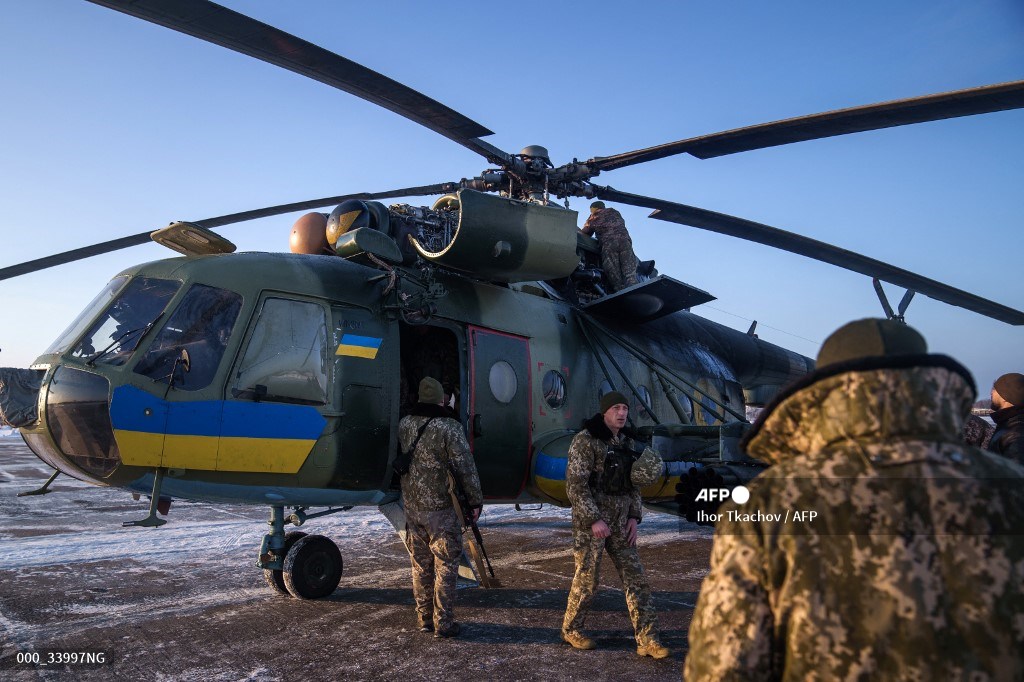 Helicopter crew members of the 18th Separate Army Aviation Brigade prepare to take off in eastern Ukraine on February 7, 2023, amid Russia’s military invasion on Ukraine. (Photo by Ihor Tkachov / AFP)