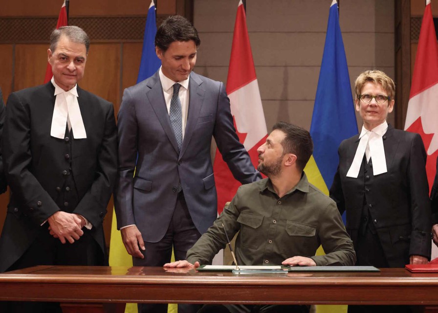 Ukrainian President Volodymyr Zelensky, Canadian Prime Minister Justin Trudeau, Speaker of the House of Commons Anthony Rota (L) and Speaker of the Senate Raymonde Gagne (R) take part in a signing ceremony on Parliament Hill in OttawaOttawa, Canada, on September 22, 2023. (Photo by Patrick Doyle / POOL / AFP)