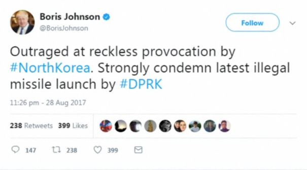 Reuters — UK foreign secretary Boris Johnson said in a tweet late on Monday (August 28) he was “outraged” by “reckless provocation” of North Korea’s latest missile launch.
