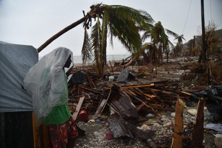 James a Hurricane Matthew victim stands under the rain in front of his destroyed house in Port-a-Pimet, Les Cayes, Haiti on October 14, 2016. Haiti faces a humanitarian crisis that requires a “massive response” from the international community, the United Nations chief said , with at least 1.4 million people needing emergency aid following last week’s battering by Hurricane Matthew. / AFP PHOTO / HECTOR RETAMAL