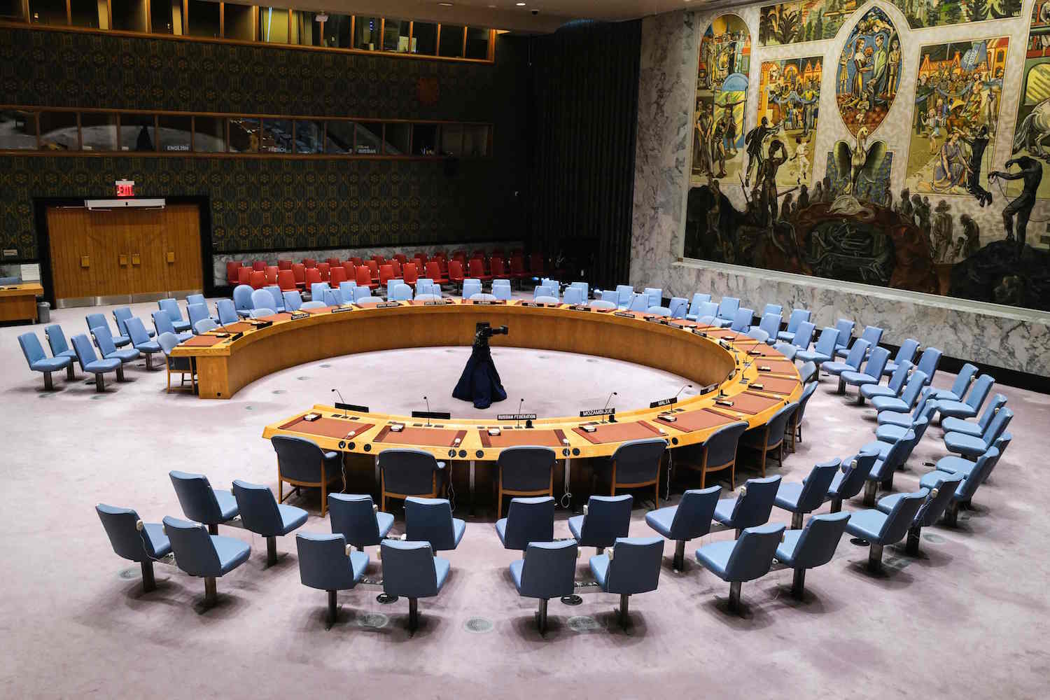 The empty Security Council Chamber is pictured at UN headquarters in New York City on December 20, 2023 prior to a vote on “The situation in the Middle East, including the Palestinian question”. The UN Security Council on Friday demanded aid be rushed to Gaza “at scale” as the head of the World Health Organization warned of a looming famine in the besieged Palestinian territory. (Photo by Charly TRIBALLEAU / AFP)