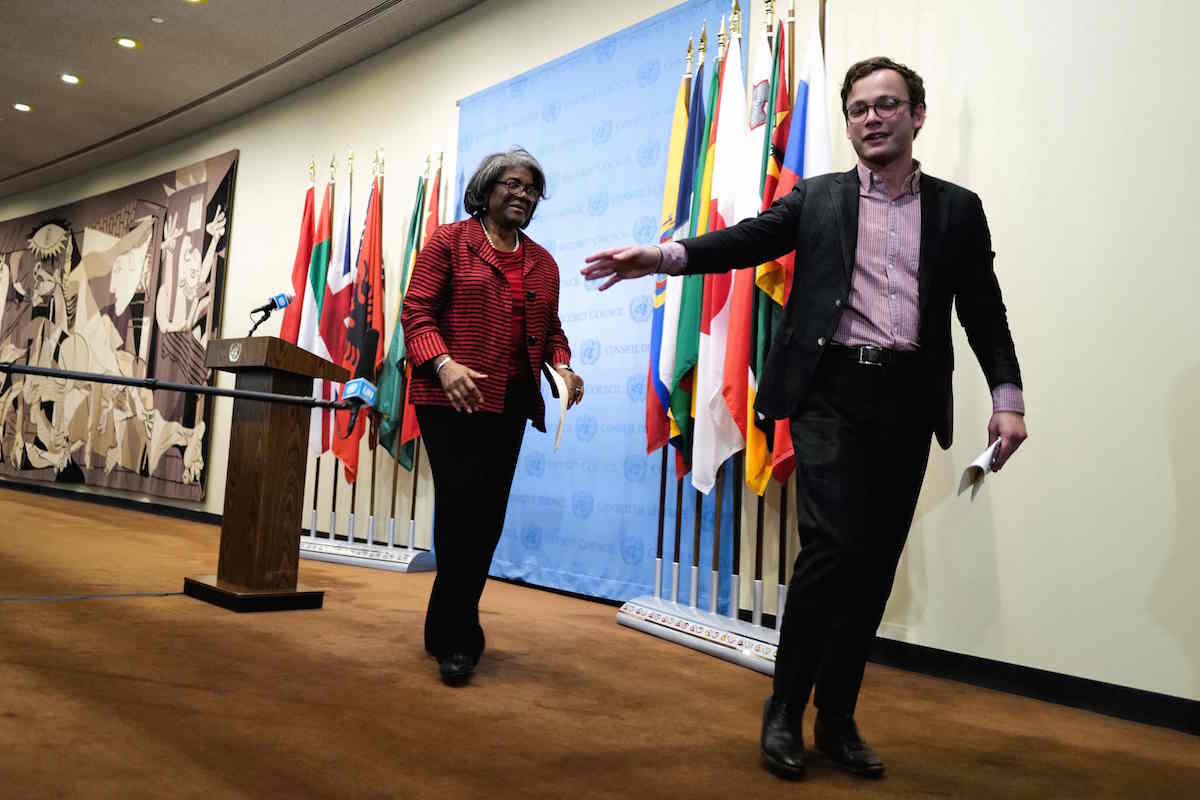 US Ambassador to the United Nations Linda Thomas-Greenfield leaves after speaking to the press after a vote to approve a resolution that “demands” all sides in the Israel-Hamas conflict allow the “safe and unhindered delivery of humanitarian assistance at scale” at UN headquarters in New York on December 22, 2023. Russia and the United States, which both could have vetoed the much-delayed measure as permanent members of the council, abstained, meaning it passed with 13 votes in favor. (Photo by Charly TRIBALLEAU / AFP)