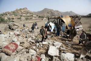People gather around the wreckage of a house destroyed by an air strike in the Bait Rejal village, west of Yemen’s capital Sanaa April 7, 2015. REUTERS/Khaled Abdullah