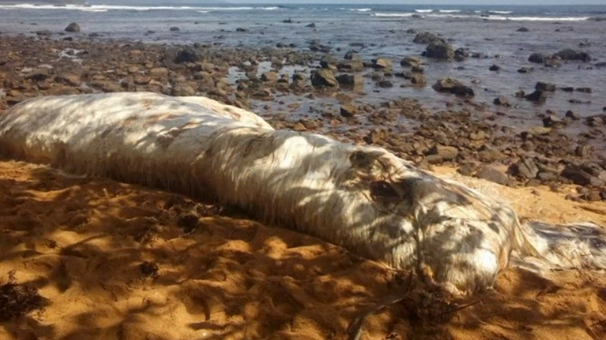 The carcass has a total length of 6.3 meters (20.6 feet), excluding the tail which is missing, and a total width of two meters (6.6 feet) from the dorsal to pectoral fin.