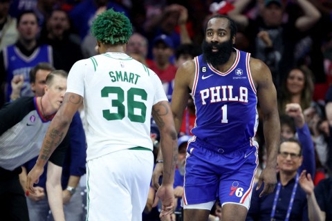 PHILADELPHIA, PENNSYLVANIA – MAY 11: James Harden #1 of the Philadelphia 76ers looks on against Marcus Smart #36 of the Boston Celtics during the second quarter in game six of the Eastern Conference Semifinals in the 2023 NBA Playoffs at Wells Fargo Center on May 11, 2023 in Philadelphia, Pennsylvania. NOTE TO USER: User expressly acknowledges and agrees that, by downloading and or using this photograph, User is consenting to the terms and conditions of the Getty Images License Agreement. Tim Nwachukwu/Getty Images/AFP (Photo by Tim Nwachukwu / GETTY IMAGES NORTH AMERICA / Getty Images via AFP)