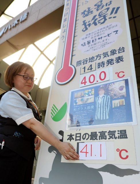 And temperatures over 40 degrees were registered for the first time in Tokyo’s metro area, where the government is promoting Uchimizu, a tradition where water is sprinkled onto the ground, as part of a summer heat awareness campaign.