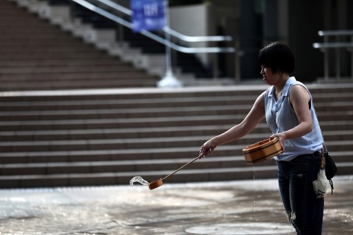 A woman splashes water on the ground during a water sprinkling event called Uchimizu which is meant to cool down the area, in Tokyo on July 23, 2018.