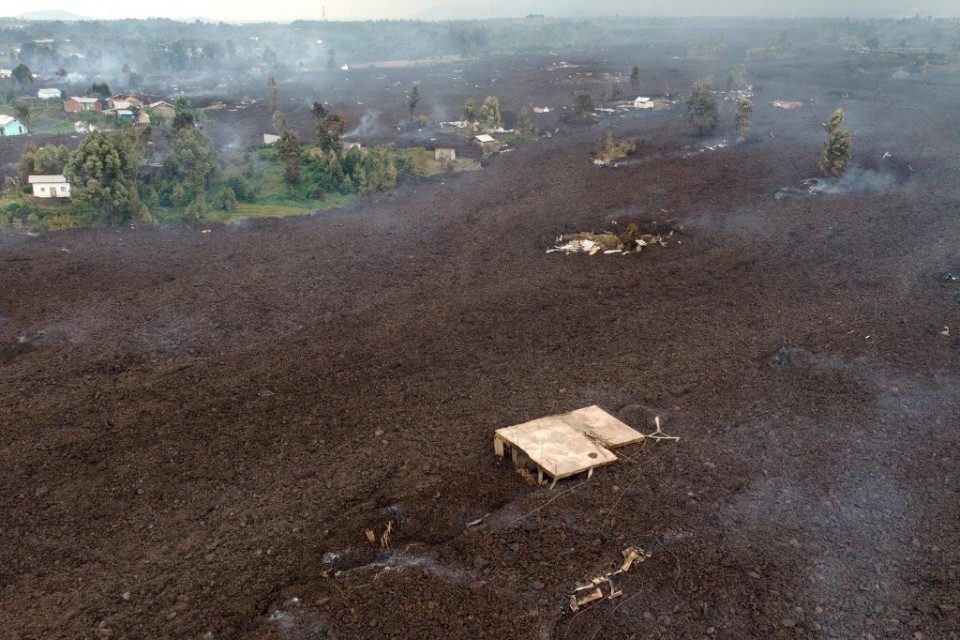 This aerial view shows debris engulfing buildings in Bushara village, Nyiragongo area, near Goma, on May 23, 2021, after a volcanic eruption of Mount Nyiragongo, that sent thousands fleeing during the night in eastern Democratic Republic of Congo. – A river of boiling lava from the eruption of Mount Nyiragongo has came to a halt outside Goma, sparing the city in the east of the Democratic Republic of Congo, the military governor of the region said on May 23, 2021. Five people were killed in related accidents. (Photo by Justin KATUMWA / AFP)