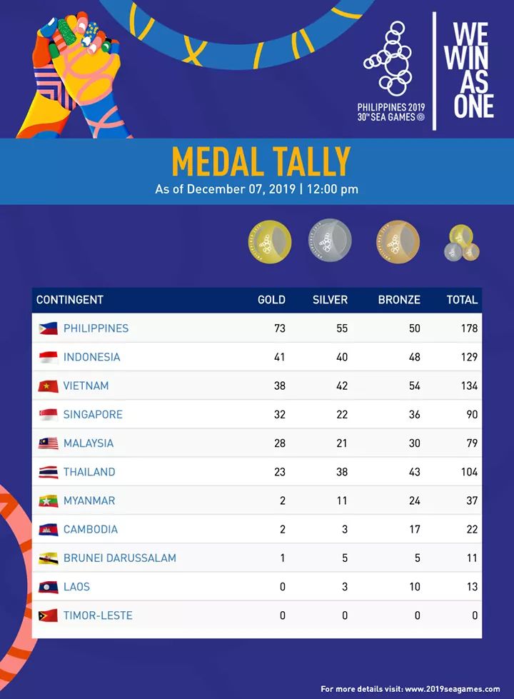 The tally, which is as of noon, December 7, shows the Philippines pulling away with 73 golds, 55 silvers and 50 bronzes, for a total of 178 medals.