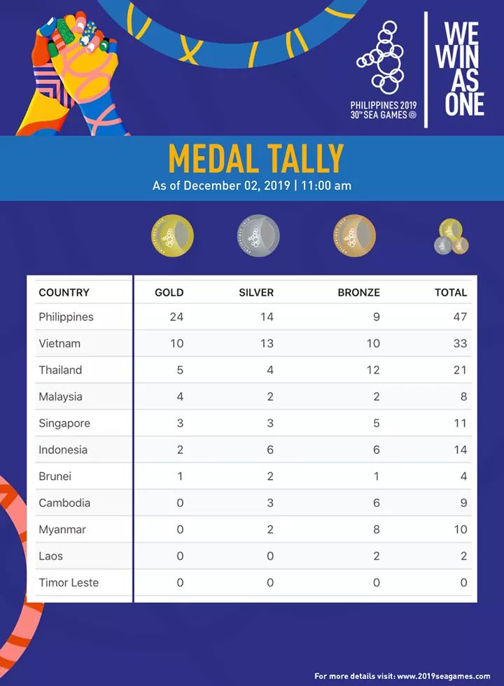 The Philippines is still in the lead, with 24 golds, 14 silvers and nine bronzes, for a total of 47 medals.