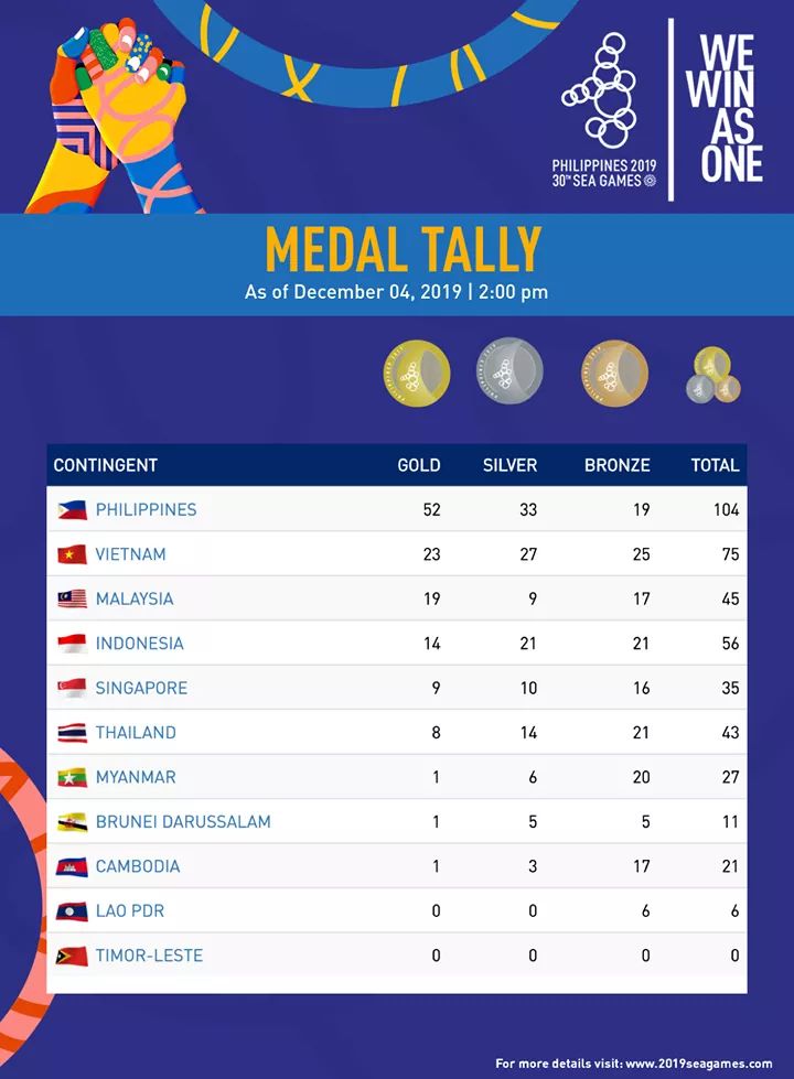 As of 2 p.m. of December 4, the Philippines continues to lead the pack, with a haul of 52 golds, 33 silvers and 19 bronzes, for a total of 104 medals.