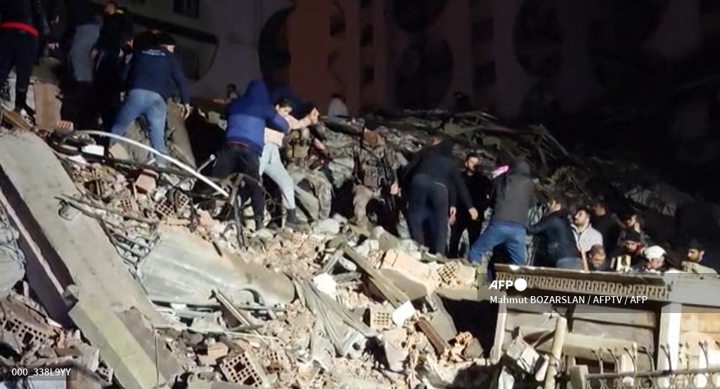 In this video grab from AFP TV taken on February 6, 2023, rescuers search for victims of a 7.8-magnitude earthquake that hit Diyarbakir, in southeastern Turkey, levelling buildings across several cities and causing damages in neighbouring Syria. (Photo by Mahmut BOZARSLAN / AFPTV / AFP)