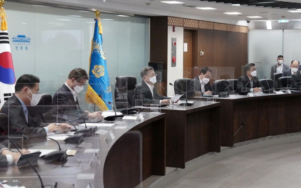 This handout taken on March 24, 2022 and released by the presidential Blue House via Yonhap shows South Korea’s President Moon Jae-in (C) presiding over an emergency meeting of the National Security Council at the presidential office in Seoul after North Korea fired a suspected ballistic missile. – North Korea fired a new intercontinental ballistic missile on March 24, Tokyo and Seoul said as they voiced outrage at Pyongyang’s most powerful launch since 2017. (Photo by Handout / The Blue House / AFP)