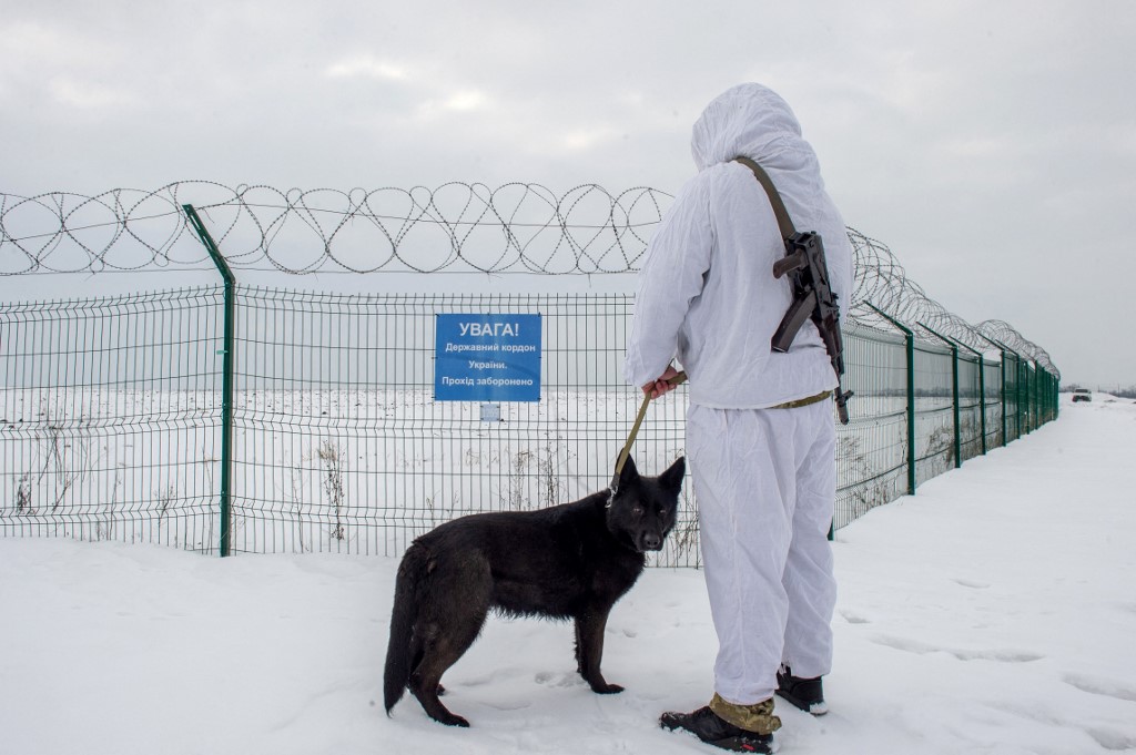 An Ukrainian frontier guard patrols along the border with Russia, some 40 km from the second largest Ukrainian city of Kharkiv, on February 16, 2022. (Photo by Sergey BOBOK / AFP)