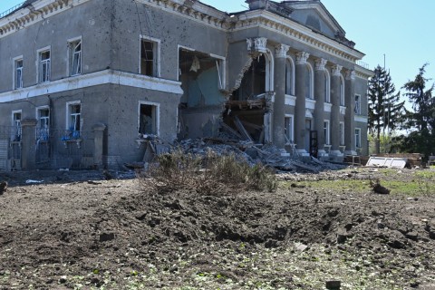 This photograph taken on May 1, 2024, shows a crater and a damaged building at the site of a strike, in the Zolochiv village, Kharkiv region, amid the Russian invasion of Ukraine. – A Russian guided bomb attack on Ukraine’s northeastern Kharkiv region killed two people on May 1, 2024, the region’s governor said on Telegram. (Photo by SERGEY BOBOK / AFP)