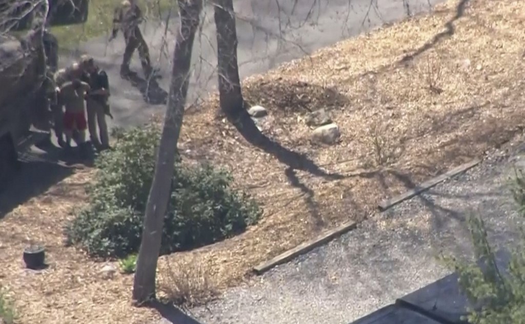 News footage of the operation, in the southern Massachusetts town of North Dighton, showed the suspect dressed in red shorts and a t-shirt with his hands behind his head, backing slowly toward rifle-armed, camouflage-clad law enforcement personnel who took him into custody.