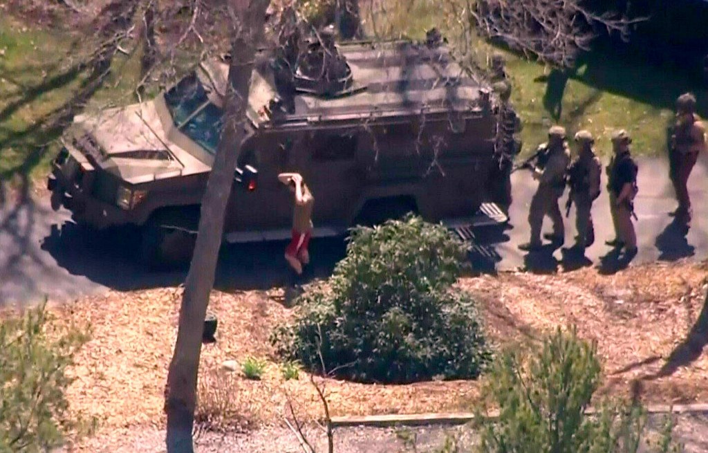 News footage of the operation, in the southern Massachusetts town of North Dighton, showed the suspect dressed in red shorts and a t-shirt with his hands behind his head, backing slowly toward rifle-armed, camouflage-clad law enforcement personnel who took him into custody.