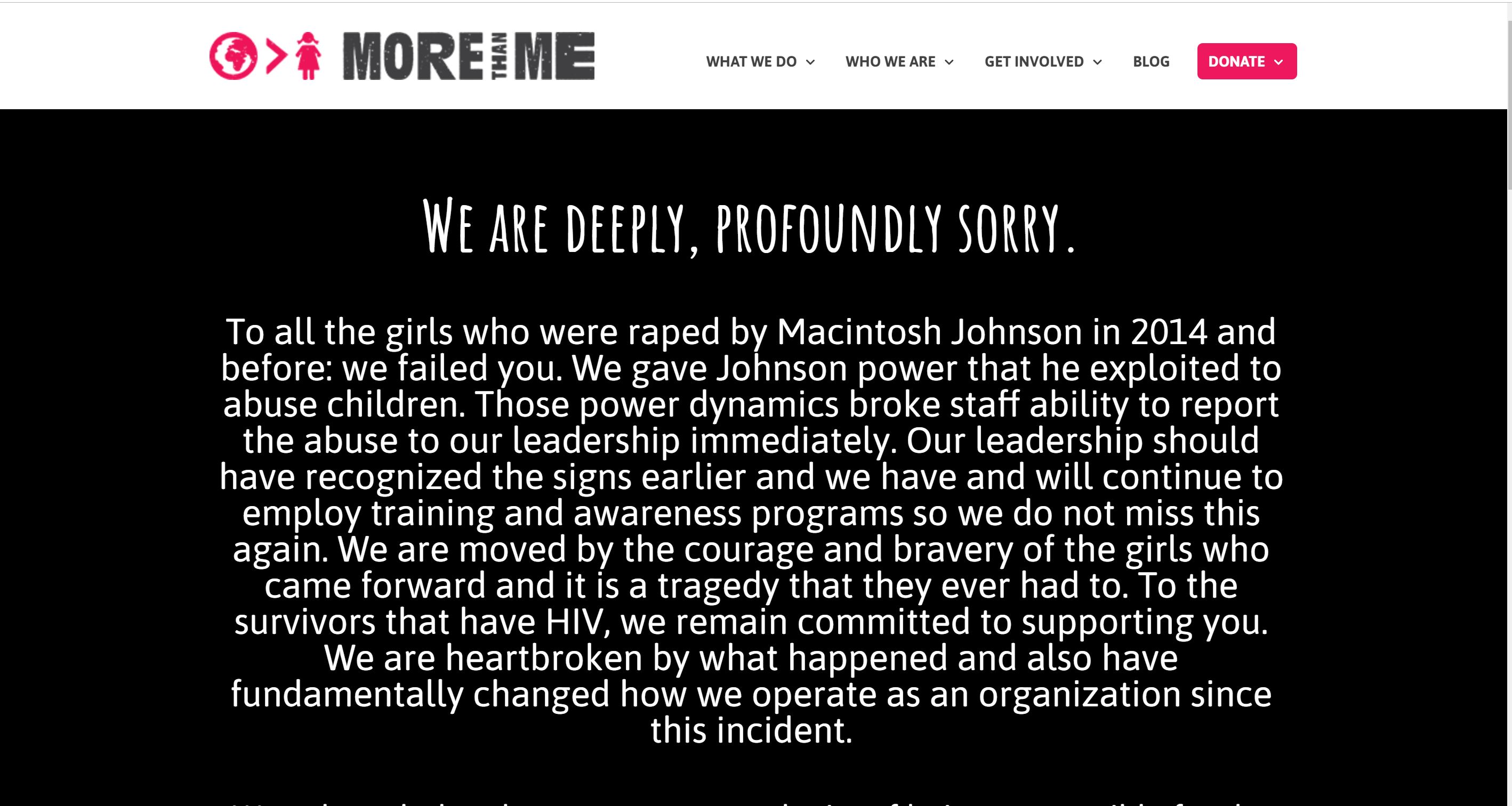 “To all the girls who were raped by Macintosh Johnson in 2014 and before: we failed you,” More Than Me said.