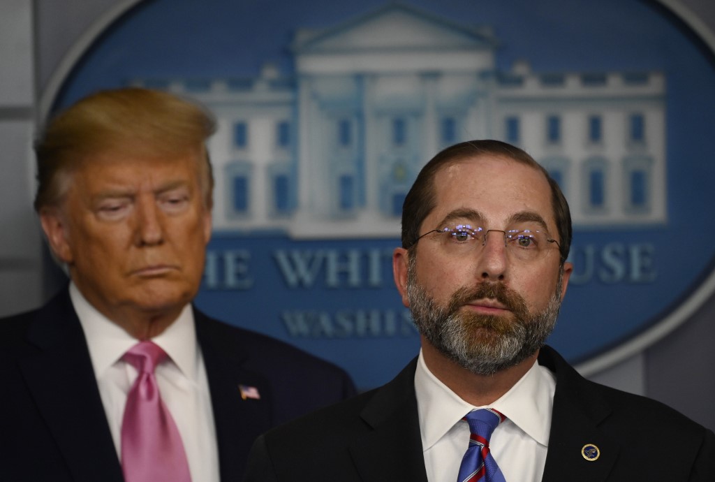 HHS Secretary Alex Azar (R) speaks as US President Donald Trump (L) listens during a news conference on the COVID-19 outbreak at the White House on February 26, 2020. – US President Donald Trump on Wednesday defended his administration’s response to the novel coronavirus, lashing the media for spreading panic as he conducts an evening news conference on the epidemic. (Photo by Andrew CABALLERO-REYNOLDS / AFP)