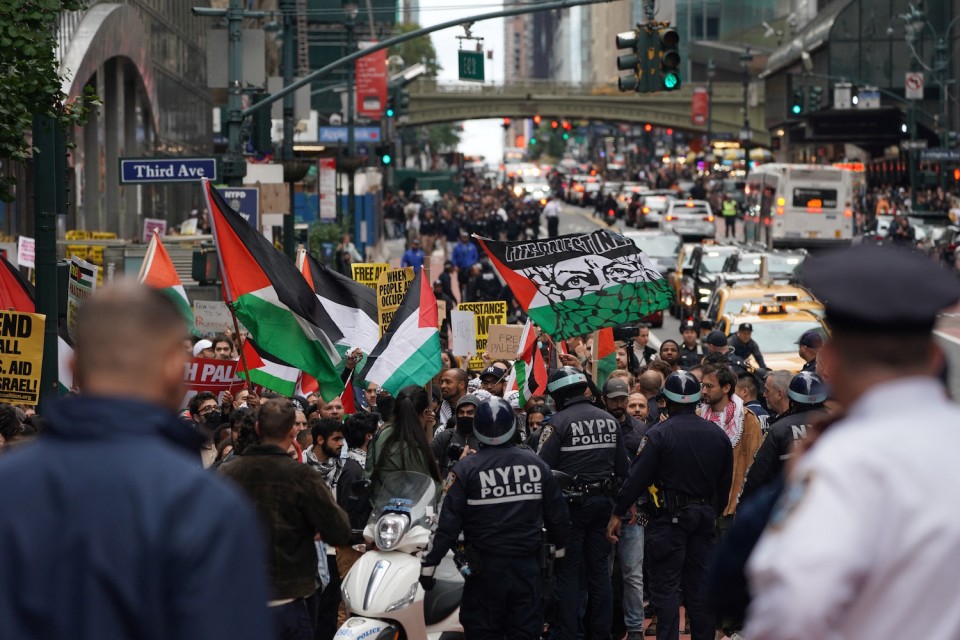 People march in support of Palestinians in New York on October 8, 2023 after the Palestinian militant group Hamas launched an attack on Israel. – Israel, reeling from the deadliest attack on its territory in half a century, formally declared war on Hamas Sunday as the conflict’s death toll surged close to 1,000 after the Palestinian militant group launched a massive surprise assault from Gaza. (Photo by Bryan R. Smith / AFP)