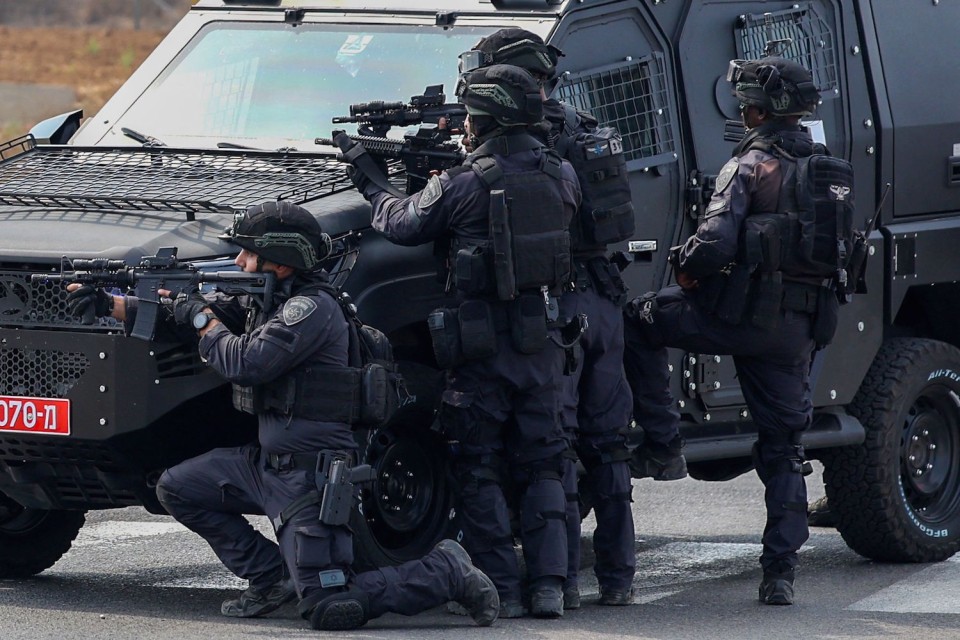 Israeli security forces take position behind an armoured vehicle at a checkpoint near Sderot on October 8, 2023. Israel, reeling from the deadliest attack on its territory in half a century, formally declared war on Hamas on October 8, as the conflict’s death toll surged to 1,000 after the Palestinian militant group launched a massive surprise assault from Gaza. (Photo by Jack GUEZ / AFP)