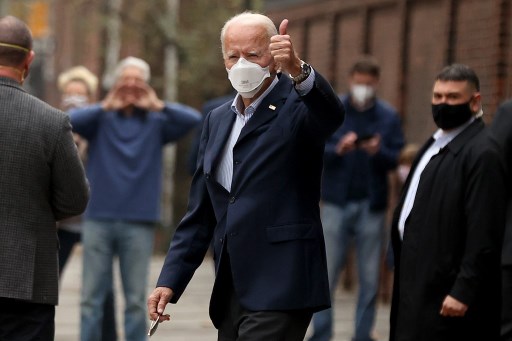 PHILADELPHIA, PENNSYLVANIA – DECEMBER 12: U.S. President-elect Joe Biden gives a thumbs-up as he leaves Pennsylvania Hospital after a follow up appointment at the radiology department December 12, 2020 in Philadelphia, Pennsylvania. According to his transition office, Biden underwent a CT scan which obtained a ‘weight-bearing’ image of his foot after he suffered hairline fractures while playing with his dog on November 28. Chip Somodevilla/Getty Images/AFP