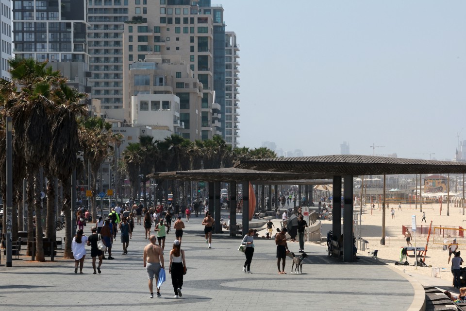 People walk along the beach in Tel Aviv on April 19, 2024, amid fears of a major regional spillover from the war in Gaza between Israel and Iran-backed Palestinian militants. (Photo by JACK GUEZ / AFP)