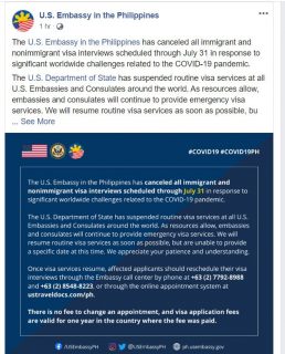The US Embassy in the Philippines on Tuesday, June 30, announced the cancellation of all immigrant and nonimmigrant visa interviews scheduled through July 31./Screenshot of US embassy in PHL announcement on FB/