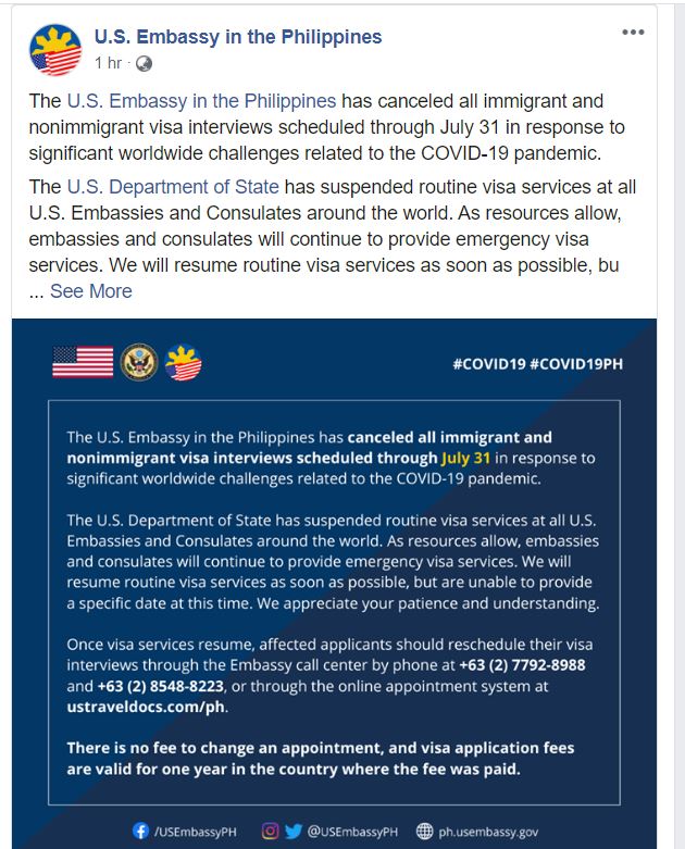 (Eagle News) — The United States embassy in the Philippines has canceled all immigrant and nonimmigrant visa interviews scheduled through July 31.